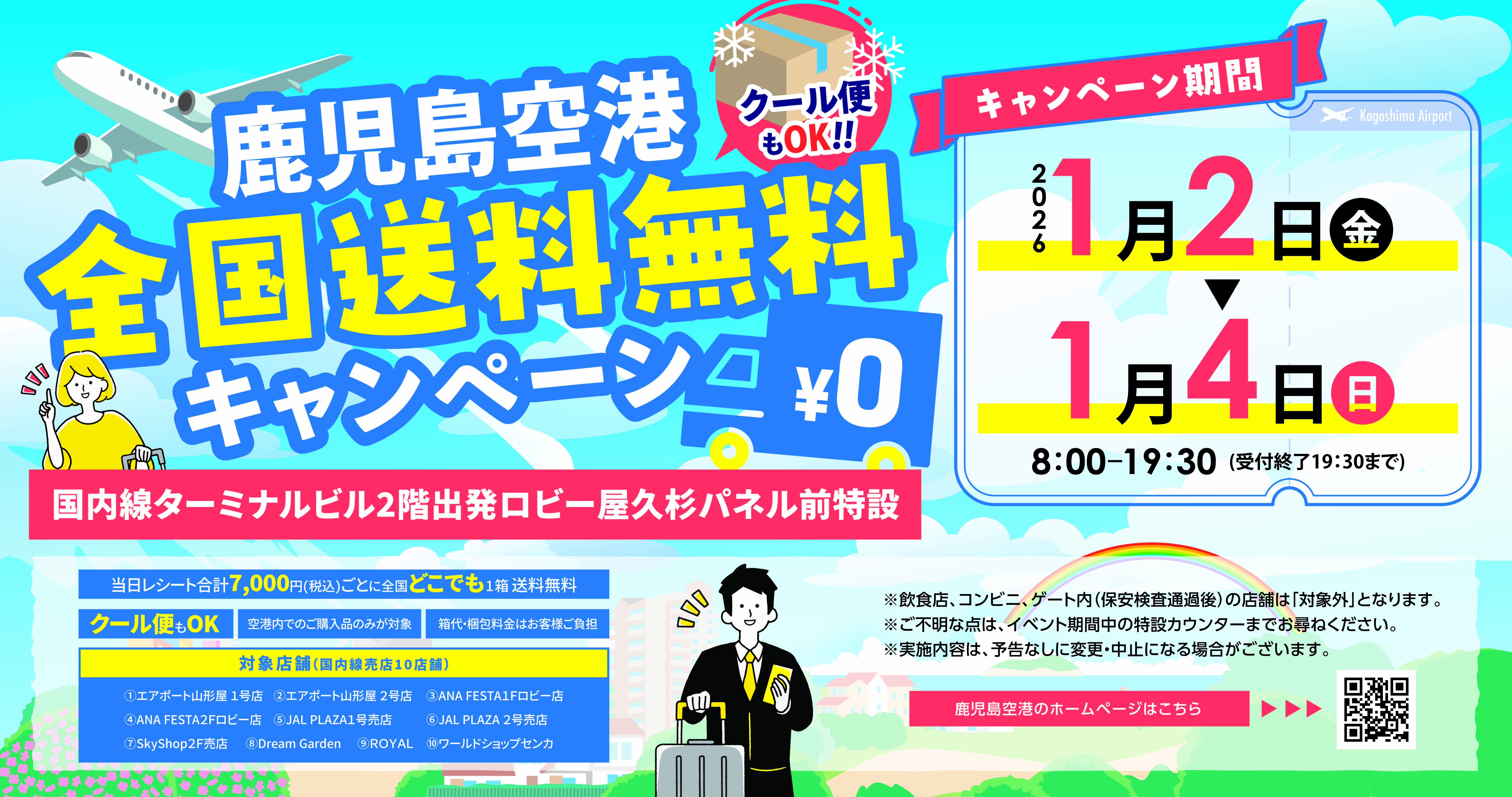 鹿児島空港で税込7,000円以上お買い物をされた方を対象とした全国どこでも送料が無料となるキャンペーンを実施します。
