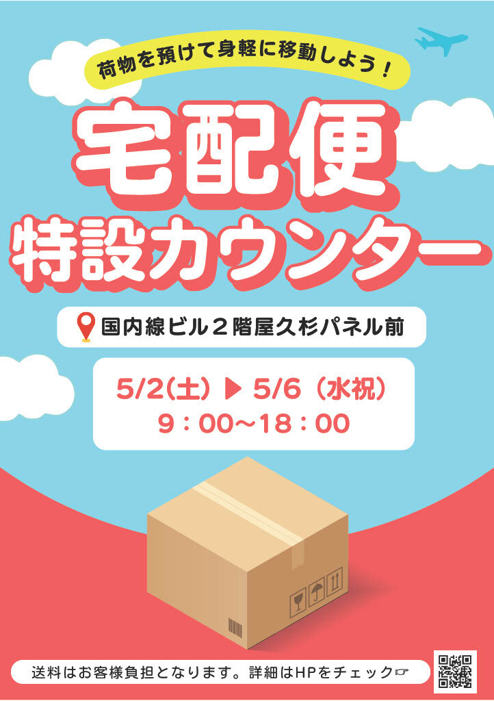ゴールデンウィーク期間中に来鹿された方が帰路につくまで快適にお過ごしいただけるよう、2階出発ロビーに宅配便特設カウンターを設置します。